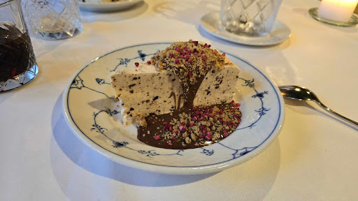Maden var udsøgt. Vores eftermiddagskaffe bestod af hjemmebagt brownie med nøddedrys og bærcoulis. Hertil friskbrygget og rygende varm kaffe. Der var rigelig kage, så der skulle en gåtur til at give plads til aftensmåltidet. Her fik vi serveret lækker lakse-tatar af kroens egen, hjemmerøgede laks. Hertil lækkert brød og smør. Flot anrettet var det. Hovedretten bestod af et stort stykke velhængt og mørt oksefilet. Hertil pommes Anna, løgkompot, baconristede edamame bønner og hestebønner samt en rødvinsglace. En flot, velsmagende og mættende servering. Desserten var hjemmelavet islagkage a la kahlua og bailey, hertil bærcoulis og nøddedrys. Jo, der var kræset om maden og serveringen.