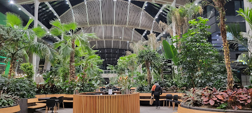 The hotel entrance has an atrium filled with plants and also shared with businesses.