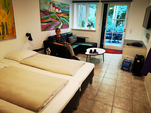 This B&B is a very well maintained farmstead with wonderful hosts. We arrived late due to the ferry and were welcomed as old friends. The grounds are wonderfully landscaped with gardens, glass houses, and paved pathways.||||The rooms are very spacious. Our room had a sitting area with a sectional sofa, coffee table and flat panel television. The beds were very comfortable, clean, and well appointed. Unfortunately, as is in most Scandinavian B&B's, Hotels, and Motels --- the pillows are flat and uncomfortable. There were no additional pillows in the room, and because we arrived late, did not want to bother our hosts. But I am sure that had we asked, would have been immediately supplied with what we needed. Our fault.||||The bathroom was large, clean, well decorated, with a walk-in shower. The decor here just makes you feel good --- Whitewashed walls with touches of lime green towels, shower curtain, and pictures.||||The walls are decorated with "fun" art and there are other fanciful art objects around the area.||||We were offered a hot drink and cookie upon our arrival and were served in our room.||||We also had breakfast in the morning --- an excellent Danish breakfast served in a peaceful dining room overlooking the gardens! The food was plentiful, delicious, and well presented.||||We loved this place and highly recommend it to anyone passing through, or...