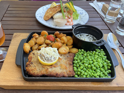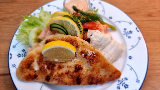 We have a wonderful dinner at the Jelling Kro. It was a lovely evening and we decided to sit outside in the shade with great views across to the Viking mound and the church. The hosts were very friendly and helpful. We went for the Beef Schnitzel (not often you get beef) and the Shooting Star mixed seafood dish. Both were excellent. The schnitzel was served with capers and anchovies with a slice of lemon which provided some saltiness to the dish. For dessert we had the Danish apple cake which is stewed apple (a little tart) and layers of breadcrumbs, very nice. The hosts showed us the old horse stables, which is now the function room, and where the carriages used to come in. Overall, a very...