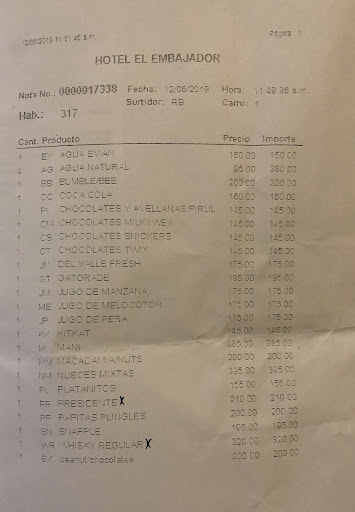 We go downstairs to pay and leave. When they show us the bill its about 13,650 in pesos (about $270 dollars) for the room and 5,500 ($107 dollars) for snacks from minibar. Now.... all those snacks i could of bought myself for about $20 dollars or less at a supermarket. So right there I’m asking to be shown what was it that racked up all that money. When they give me the paper bill, they had charged me for all the snacks including the liquor. Now just so you know, we have our religious beliefs. We don’t drink and we have 2 children with us. A 1 and a 2 year old. We don’t drink. So now I’m telling them the same. They said the bottles aren’t there. So we say lets all go back up together and go look. The guy seems hesitant but walks towards the elevator. When we get to the elevator he says no, lets handle this down here. He tells the guy to remove those 2 liquors from the bill and let us go. So we still paid a ton for super cheap snacks. Now you can just look at the pictures and convert some of that stuff to your currency and see its insane. I mean just look at the bottle of water. $380. Thats almost $8 dollars.... for a bottle of water..... WATER..... that i never drank.... In the end, i just paid for the rest of the snacks.... which was all of them.... without fighting because i just wanted to get out of there.