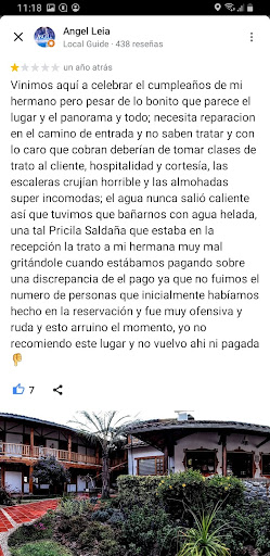 Read moreOnline Hosteria Caballo Campana looks like a beautiful horse farm with cozy rooms and a large property to walk or horseback ride on. Generally speaking it is that, but it appears to have fallen a bit into disrepair as it seems nothing has been updated for decades.||||We showed up early as there are only certain flights into Cuenca, and there was no one at the "front desk". After about an hour the owner showed up and promptly informed us that we had booked the wrong room. We didn't understand this but we followed him anyways and he brought us to a very small room that we did not order. We instructed him to take us to the cabin that we had ordered, which he did begrudgingly.||||The room was very plain but more spacious so we accepted it and got settled. The cabin is a master bedroom downstairs (no doors/no privacy) and 3 beds cramped together upstairs dorm style in an open loft. There was a small couch with a TV that did not work. There was no phone or internet in the rooms. The bathroom was reasonably modern but you could either have hot water on (scalding) or cold water (freezing) you could not mix the two to get a normal temperature.||||We were immediately turned off by all of this but decided it was too much hassle to change hotels so we went for a horseback ride. This was the best and only good part of our stay. The scenery was very nice and the horses were calm and easy to ride. Our guide was friendly and helpful. After this another one of the owners told us to go to the hot springs. This sounded nice so we agreed. However, the hot springs were simply a warm pool filled with splashing children at a nearby motel. This was a bad recommendation and we did not appreciate the waste of time or cab fare.||||After going out for dinner, we came back and went to sleep on the bed that resembled more of a piece of plywood than a mattress. When we awoke, there were large beetles throughout the room and we decided immediately that we were leaving. However, we waited over an hour for anyone to show up at the front desk to check us out.||||The only reason i gave this 2 stars instead of 1 is they were allowed me to simply pay for the 1 night we stayed there and not the 3 nights we had booked. Additionally, the horseback riding was a good experience that we were glad we had the...