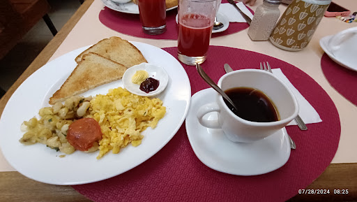 En cuanto al desayuno que está incluido, muy rico todo. Las porciones muy buenas para cada uno. Cabe destacar que hay una zona de café en la que puedes servirte las veces que gustes. El almuerzo y las meriendas también las venden en el área de restaurante y lo preparan muy bien, el personal de restaurante nos ayudó muchísimo con nuestro niño de casi 3 años al licuar la sopa para que él comiera. El personal del restaurante tanto en el desayuno como el de las otras comidas demasiado atentos, muy serviciales, excelentes personas. El hostal es céntrico, está cerca de todo, llegas caminando a cualquier lado...