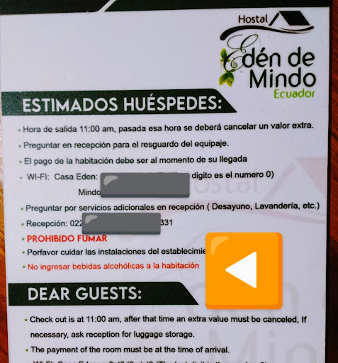 I stumbled upon this hotel while wandering Mindo looking for a hotel that would accept payment by credit card.* I am very happy I found Hostel El Eden, because I had a lovely three-night stay at this charming location. The wood construction felt cozy, and Victoria did an excellent job anticipating anything I might want or need and making it available before I asked. The hummingbirds who frequent the patio were an added bonus! I will definitely stay here again the next time I visit Mindo.||*There is one ATM in town that I couldn't get to work, so I was trying to...