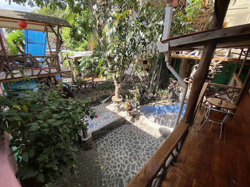 This lodge is welcoming and fanciful in the AMAZING way that Victor built it, more intricate and sculpted than the Swiss Family Robinson treehouse, with innovative staircases, bottle & tilework, portholes and windows, textured walls and beams, wrapping into trees and vegetation. SO IMAGIANITIVE!!| Victor was essential in setting up our second leg of our Galapgos adventure after our cruise. He got us over to Isabela and tours there, and he provided warm conversation about life in Puero Ayora. I wish I had more time to get to know him! Just two blocks off the tourist strip, this is a gem, a local landmark that you shouldn't miss. It appears to be still a little quiet after the pandemic, and I hope the kitchen and entertainment deck gets lively soon. Bike rental was great for returning from the tortoise reserve, and other services were available too.| Would have loved to have fresh coffee instead of instant in the morning, but waking up in this unique treasure was worth it, and we stayed here again on our return...