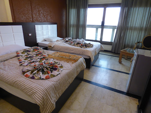 Самое главное в «Nile Sky Suites Hotel» это его расположение и вид из его номеров на Нил!! По крайней мере половина его номеров имеет вид на Нил, но об этом лучше позаботиться заранее. А вид с 17-го этажа открывается замечательный!! Учитывая то что 2 этажа основания не считаются, но вместе сними получается 19-ый этаж с прекрасным видом на Нил, мост Каирского университета, Оперу!! Завтрак чисто арабский. Понравились блины с зеленью. Картошка фри тоже. О европейском завтраке нужно указывать особо. «Nile Sky Suites Hotel» отличает стильный ремонт в стиле Hi-Teck, который больше ожидаешь встретить в Нью-Йорке или в Голландии. Розовые потолки, точнее розовая подсветка потолков это прекрасно!! Электрика вообще на очень хорошем уровне. Очень удобные прикроватные выключатели света, что откровенно и положительно удивило. Работало отлично всё, кроме сейфа. Оказалось, что кроме кода, нужно пользоваться ещё и ключиком. Тогда он прекрасно работал с двойным уровнем безопасности. Вообще над «Nile Sky Suites Hotel» явно поработал строительный стилист. Быть может он не всё довёл до конца, не всё свёл воедино, но положительное упорство было заметно, Чего стоит плитка в душевых с паровозными мотивами в чёрно-белой гамме а-ля середина или точнее первая треть XX-го века!! После душа было где отдохнуть не только на кроватях, но и на креслах. А затем надлежало заниматься тем, ради чего нужен «Nile Sky Suites Hotel» - самостоятельными прогулками по Каиру вобщем и к Пирамидам в особенности!!! Именно для этого «Nile Sky Suites Hotel» подходит лучше всего. ... Мы выбрали «Nile Sky Suites Hotel», так как при выходе из здания сразу возле мечети Салах эль-Дина (مسجد صلاح الدين) на улице Аль Сарайя находится остановка новых жёлтых автобусов М7, которые идут прямо почти до самых Великих Пирамид Гизы и Сфинкса сразу через Мост Каирского университета, узловую остановку метро и автобусов «Гиза» и далее по улице Аль Харам. Причём всего за 15 ₤E. Воду или «Фанту» перед прогулками купить лучше сразу на выходе из подъезда дома, в котором находится «Nile Sky Suites Hotel», у продавца, который торгует прямо на улице у стены дома. Напитки у него стоят в холодильнике, что для жары правильно. Бутылочка воды 0,5 литра стоит 3 ₤E. 1-литровая бутылка «Фанты» стоит 12 ₤E, а у Пирамид она уже стоит 20 ₤E. Рядом продают шаурму в разных видах на выбор. Если боитесь есть местную еду, то путь будет чуть сложнее, так как ближайший «KFC» и «Pizza hut» мы нашли в 500 метрах, возле Моста Аббаса на улице Эль-Равда (٣٧، El-Rawda, Al Manyal Al Gharbi, Cairo Governorate) возле заправки «Total». Но «KFC» работает только с 11.00 до 03.00 ночи, то есть хорош уже после поездок. «Pizza hut» открывается ровно в 11.00, но вместо куриных ножек при заказе «Trio» там были только цыплячьи, что не было сытно. Пицца тоже не является сильной стороной арабской кухни. Положительно было то, что несьеденное быстро уложили в коробочку на вынос. Поэтому наш выбор «KFC» с приятными и понятными Твистерами за 46 ₤E, с пепси-колой, картошкой фри. Очень понравился Креветочный набор за 100 ₤E с рисом и капустным салатом. И в «KFC», и в «Pizza hut» работают кондиционеры. От них или к ним, к Пирамидам или от Пирамид идёт такой же современный автобус М11, что тоже очень удобно. Пугаться Каирских пробок совершенно не стоит. Автобусы идут вровень с маршрутками или даже быстрее. Они откровенно безопаснее для самостоятельных поездок. Снабжены кондиционерами. А главное, что важно для со