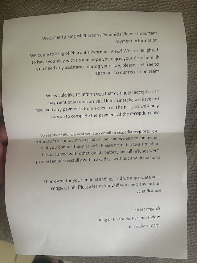 Read moreThis hotel names itself 'majestic view pyramids inn' on booking.com, beware! I was scummed by the man who checked us in. I booked a deluxe King room, as I saw great reviews on bookimg.com and price was reasonable. The room I was given was nothing close to duluxe, crammed up, broken tiles on bathroom floor, things were badly fixed and positioned, hardly any room to move. Before giving us the room, the guy tried to sell us few things which we politely refused as we thought his quotes were too high.||Before checking us in, he asked for my pin from booking.com, then went and cancelled my booking, he then approved the cancellation. I was not aware but when I went to write a review I realised that I couldn't give a review, reason being I cancelled it (which I didn't) we stayed that night and paid in cash, we spent time in other hotels to enjoy the atmosphere. ||I'm writing this so others are aware and don't fall for the trap. They may be having a good room but most likely saved for those that are going to spend more on his offers. ||At the door of the hotel the name was 'king of Pharaohs pyramids view', when I questioned the name on booking.com, he said they have several floors and different hotels in the same building which was a complete lie. The top floor has a beautiful rooftop. ||The day we were checking out, there was a younger guy and an old man, both were very nice...