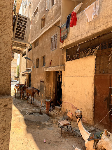 The building itself is very old and desperately needs to be remodeled. The entrance is a short distance down a deserted alleyway (it's totally safe, only about 10 feet) but the sign is tiny, so we had a very hard time finding it. It's a grungy area but there are shops around. We didn't really walk around much, but it's a great location for the pyramids.