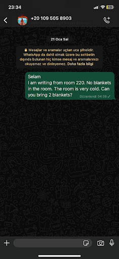 Otelin eksikliklerini ve odaların pisliğini kendilerine anlattığımızda ; gece bizi arasaydınız gelir temizlerdik. Sizin hatanız diyerek üste çıkan bir tavırla karşılaştık. Bizim o gece giriş yapacağımız belli olup odayı bizim için biz gelmeden hazır etmeleri gerektiğini bir türlü kabul etmediler. Odada yorgan, battaniye hiç bir şey yoktu. Bir kaç odaya gönderdiler, bizim odaya onu dahi göndermediler. Sabaha kadar dondum. Vücut direncim yorgunluktan düşük olduğu için extra soğuk hissetmemle birlikte; bir örtü verilse ona bile razıydım. Havlumu üstüme örtmek zorunda kaldım. Gece otele mesaj attım, aradım ulaşamadım. İnstagram sayfasına, hatta mail adresine bile yazdım. Yorgan getirmelerini istedim. Ancak getirilmedi.
