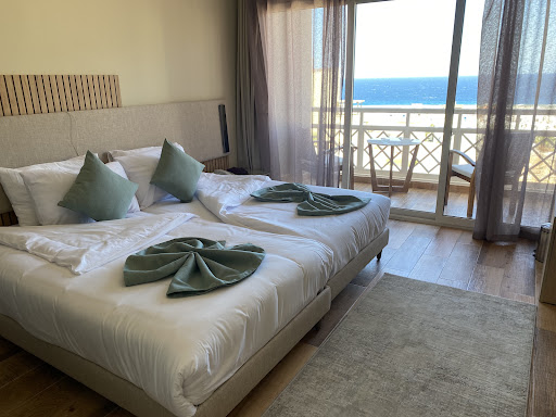 The room was amazing. New, comfortable, modern, nice shower and bathroom, towels, toiletries, mini bar, ac well equipped. The receptionist Israa was such a sweetheart, professional and very helpful. She makes you feel like home, hotel is lucky to have her. Same with the driver Abdallah, very nice guy, good driver and always with smile and trying to help. The assistant staff Yasser was very kind, helpful and also very friendly. These three people make a difference and make you feel good while other staff I can say I did not feel good about. Some were rude. I recommend the hotel keep people like Israa, Yasser and Abdallah they make the difference. The manager Abd Elnaser helped me also with a problem I had and I could work properly thanks to him. ||The area is kind of developing so is new and there is nothing around. The road to arrive is awful with a lot of bumps. As I said is a new area so still under construction. It was uncomfortable to arrive. The beach was not very good rocky bottom and you can cut yourself, not recommended. The pool is just ok nothing impressive. The service overall is not good, lot of staff, too many people, most of them male staff and not friendly. I had a heated argument with two waiters. They don’t care about you, they don’t make you feel welcome, they are very slow and not smiling. Like they hate to be there. That’s why I say keep those three people I mentioned before because the rest make you feel unwanted. The hotel is over staffed and even though they don’t function properly. The beach is far from the hotel and you need to wait for shuttle car. Breakfast is not ok, not variety and not good quality. Restaurant is a bit better a la carta and service is better when is not buffet. My room was just on top of the restaurant with entertainment going on until 11pm and I could not sleep or relax for those 4 hours, annoying. Next to my room staff use that room to rest or chill, so I could see many of them there all the time moving stuff xand did not make me feel...