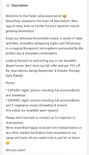 Read moreAmazing place, really kind people.. No neighbor camps around, so itâs quiet; surrounded by colorful coral reefs and powerful silent mountain valley is perfect for artists, musicians, and everyone looking for inner...