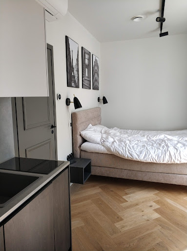 The apartment was, however, very tidy, smelled good and had a thermostat for climate control (which we could not figure out how to use, apparently they were locked on the preset temperature - but this could've just been user error). The living room is clean with plenty of space for a single person or a few people for a shorter stay, as the couch could also be extended and turned into an additional bed. There is also enough room and furniture for a business stay. The kitchen had all the necessities provided, such as an espresso machine, a microwave, an induction stove and coffee, tea, sugar and some basic appliances. There was however no milk for adding to the coffee, which is fine but did cause a slight inconvenience. The bedroom was fine, a comfortable bed and good air circulation, and no distractions. The bathroom looks fantastic, but the shower is designed in an awful way so that during any sort of prolonged shower, practically the whole bathroom is flooding with water. There was also no toothpaste anywhere to be found, which was an inconvenience as we fully expected the basic bathroom necessities to be accommodated for. At least there was plenty of toilet paper, a shower gel that doubled as shampoo, which was okay. Overall a comfortable living space.