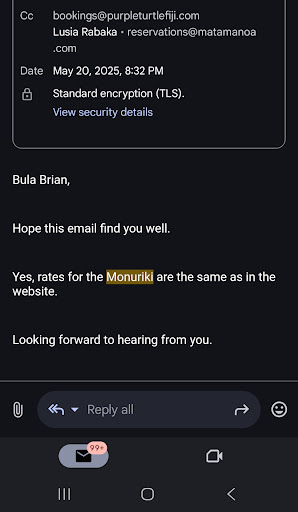 A week later, when we were on the Yasawa Flyer ship to Matamanoa we got a call to inform us that our reservation was given to someone else and we'd no longer be able to stay on the island as expected. We spent one night in a garden room at Matamanoa because we had nowhere else to go and their management team have humanity. But it was not a quality room. The manager of Purple Turtle, Trevor, who arranged our next day departure, informed me (again, I paid $850 FJD in full) that he was informed by the reservation team that they should not pick us up at all and leave us stranded. He's a nice guy. He didn't do that... and we already paid!