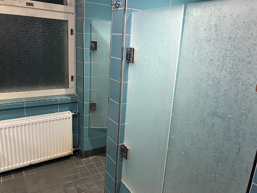 The bathrooms were clean, but the showers were awful because there were two doors of frosted glass that swung open like doors on a Wild West saloon. When they “closed” a gap remained, so there was basically no privacy, made worse by the fact that your reflection is right there in the mirror for all to see!