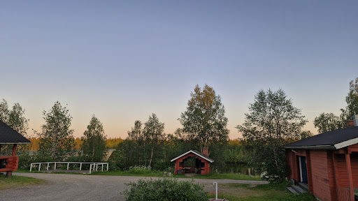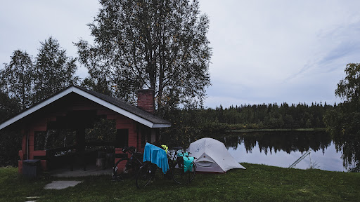 Located just off the main road it was very convenient to stop (however you hear the road noise). We stopped on our bike tour North and we ended up even extending our stay for an extra night due to rainy conditions. Sauna & river dip were great. You can pitch a tent ⛺ anywhere on the grass in front of the cottages - it wasn't busy so we picked a spot overlooking the river. There is a small kitchen (microwave, kettle, coffee machine) with a table & benches to sit in the rainy weather. There is also a washing machine & dryer that are included in the price. You can also use a cosy Kota for bbq and chilling in the evening (the vent worked very well!). There is also a sheltered BBQ area. There was no good wifi - you can get some at the café next door (very friendly place) or sit on the steps outside (not very reliable connection). Overall great value for 10€ for two bikers & a tent. You can leave cash in the box next to the café or pay in the café in the opening hours 10-17. There are no codes needed on-site to get to the...