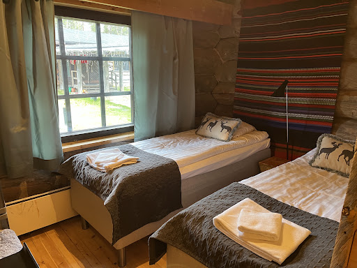 This is a very large log cabin with 7 rooms and separate men’s and women shared toilet and shower facilities. We had an enjoyable single night stay The twin room was very small, 8m2! It is very cosy for 2 people and there is not much space to storage luggage as there is no wardrobe. There is also a fridge in the room as there is no common fridge in the common kitchen. The kitchen and living rooms are very modern and the kitchen is fully equipped with induction cooktop, oven, microwave, kettle and dishwasher. The toilets are clean and there are multiple washing machines and a drying room available for free. The men’s shower was not working but the one in the sauna block was available. The sauna, separate men’s and women’s, is excellent and is included. It is available from 18-21. We booked the room for a single night and it came with linen and towels. Breakfast is included but you must go to the Holiday Camp Hotel, which is a 10 min walk. We enjoyed our stay but we were the only ones in the entire cabin. If it was full then it may be quite crowded and your room is not very...