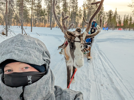 We arrived at Ivalo airport to be greeted by the friendly driver from the Hotel and the transfer was quick – less than half an hour door to door.|||We had already ‘checked-in’ on-line before our arrival, but we had a few questions for the Reception staff and they were very were attentive and welcoming. In the meantime, the driver had delivered our cases to our ‘Scenic Suite with Sauna’ room! |||The accommodation was a great choice. The Suite was quite comfortable, clean and spacious for two people. The small kitchen had an induction hob, microwave, fridge, coffee machine, kettle and cutlery, pans etc. – everything you might need to make light lunches, snacks and hot drinks!|| ||The beds were comfortable and the wet room (shower room) was modern and met every need. A compact living area with sofa, coffee table, and television was nice and relaxing.||We didn’t use the sauna but it looked wonderful.|||A great bonus was the ‘Drying Cupboard’ to dry off clothes and boot liners after a day in the snow! |||Underfloor heating kept the room toasty – in fact a little too toasty until you get the thermostat worked out!|||The views from our balcony across to Saariselkä were wonderful on clear days and the village lights twinkled in the dark skies. |||And, by the entrance, there were three toboggans for us to use.|||Daily room cleaning is available but you can opt-out as we did. We only needed a change of towels halfway through our stay and some extra toilet rolls and coffee pods along the way. We mentioned this to the Reception staff and they were quickly delivered to our room.|||We cannot fault any of the staff at all – everyone was friendly, helpful, spoke excellent English and seemed to want you to get the very best from your stay there. It was interesting to chat to the staff and discover their stories of how they came to be working at the Hotel. Several are not from the region, or even from Finland, but return each year for the winter season.|||The Restaurant was excellent, as were all of the staff working there. The breakfast was full of variety and the only problem was what to choose to eat as there was so much choice!! ||In the evenings we enjoyed the set-menu and all of the meals were delicious! There is also an à la carte menu.|||Activities are plentiful, varied, interesting and sometimes a little challenging. They all start from the reception of the Hotel, with some involving a trip to the Hotel’s Wilderness Centre which is about twenty minutes journey in the Hotel’s mini-bus or coach. We had booked some activities before we arrived but Cass and Kasper were very helpful when we wanted to book some more.|||A couple of hours after we arrived at the Hotel we went to get fitted for our snowsuits – all very well organised. The Hotel will provide a thermal suit, thermal outdoor boots and thermal mittens for the duration of your stay (as well as a helmet if needed – for example, for snowmobile adventures). We had brought our own arctic clothing, but still used the excellent Hotel-provided thermal suit and thermal mittens for the activities. |||During the ‘Traditional Reindeer Experience’ we met the reindeer and then went on a joyful reindeer sleigh ride with two people per sleigh. We were given lots of information by a very experienced reindeer herder and by our guide, Henry, who told us about the Sami languages and Finnish life while we all sat around a warming fire drinking hot apple juice. After this, there was a good soup and salad lunch back at the Wilderness Centre.|||Our ‘Aurora Hunting – Adventure by Car’ was led by a knowledgable and enthusiastic Jannika. ||We were lucky to see the very active northern lights from all three stopping places that evening and the group took some very good photographs. There were only seven in the group and four were quite young ‘twenty-somethings’ who hadn’t really come dressed well for the cold and just wanted to take a quick snap with their phone, jump back in the mini-bus and send photos to their friends. Three of us were enjoying the experience and were happy to take many more photographs and had come more prepared. Jannika did a great job of managing the two parts of a group with split aspirations. However, this is something you should bear in mind when you book this activity – it is the luck of the draw who ends up in your group!|||The ‘Northern Lights Wilderness Dinner’ was very enjoyable – a chance to try all the local cuisine. It was a beautiful spread of food and you were encouraged to try a bit of all the dishes on offer. The chef cooked the main course of meat/fish over a huge wood-fired grill. It was a lovely evening, but to hear some Sami folklore as well would have been the ‘icing on the cake’ for us. That’s just a personal view though.|||Sadly, although we went prepared, the Northern Lights didn’t make an appearance during the Wilderness Dinner. However, an hour after we had returned to the Hotel, the sky cleared and so we walked for five minutes up towards the top of Kaunispää. The Northern Lights were clearly visible and so we went back to our room, got our camera gear and went back out! Ninety minutes later the Lights began to fade, but we had well over four hundred great photos taken from next to the Kaunispää viewing tower.|||The ‘Snowshoe Safari in the Wilderness’ with Tommi was great fun! We walked through the trees to the top of the gentle hill, often through knee-deep snow. There was a welcome break at the top where we took a seat on a log, drank hot apple juice and gazed across the snowy and serene wilderness. Then it was time to walk some more. Listen carefully to the information at the beginning of the session as there are a few techniques to remember! We listened but got a bit lost in the moment just after the halfway break and ended up toppling over in the deep snow which was hilarious! We didn’t stop smiling for the whole two hours and finished up back 