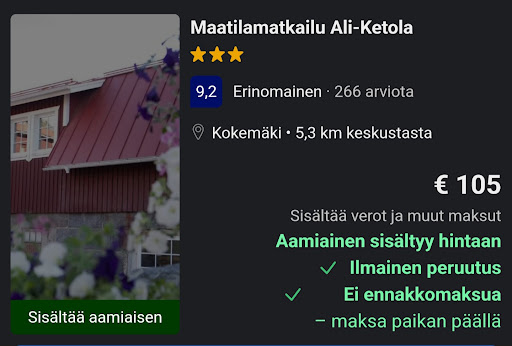А вот нас обманули. Мы сделали бронь и оплатили 4 дня сразу, хотя в рекламе написано, что бесплатно можно снять бронь. Муж оплатил и не увидел, что нельзя брать собаку. На следующей день, я писала личные смс, и заказ был сделан через Booking и отмену же сделали тоже через Booking. Sirpa или работник отеля они игнорировали сообщение Booking. Я написала лично, но он так и не ответил. И деньги не кто не вернул. Мы с мужем за три года решили позволить себе отдых в отеле хотя-бы финском селе . Не поехали в Турцию или ещё в другую страну. Мы с Украины и так на всём экономим потому что и так тяжёлая ситуация. Умерла мама и я хотела, как то побыть на природе и в тихом месте со своими мыслями. Но вот так мне добавили стресса, хотя нам на учёбе говорят, что Финляндии фины порядочные и не кого не обидят. Наверное эти люди решили, что мы богатые иностранцы которые плохо знают свои права и финский язык и можно нам и не возвращать деньги. Так вот знайте вы меня разочаровали и эти деньги вам не чего хорошего...