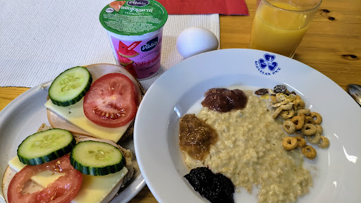 There are couple of toilets and showers, so you don't have to wait. The breakfast is very traditional Finnish brekky, porridge, boiled eggs, bread with different toppings, yogurt, coffee/tea, and juice. There's also an extra kitchen for the guests to use.