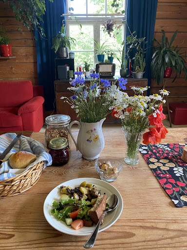Lovely cozy warm atmosphere in Villa Ponsa in Ponsantie, Kangasala. I also slept hery well in a real bed in the beautiful garden in a tent. I also enjoyed sauna in the evening watching cranes on the field. Tarja makes all food and cakes for the summer cafeteria with local ingredients. Berries and mushrooms from the nearby forest, some berries and vegetables from own garden. This place is also dog and child friendly. People of all ages and all nationalities feel welcome. Garden is full of flowers and you can enjoy coffee, tea, cakes and pies either indoors or outdoors. Almost everything to eat is gluten free and...