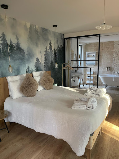 Concernant notre lodge - le lodge Antoinette : Globalement, la chambre est décorée avec style. Le sol, les murs, la salle de bain ouverte en font un endroit chaleureux et laissant beaucoup place à la lumière. La tête de lit, en vieux bois laisse échapper une senteur très agréable pour se détendre. D’autres détails importants viennent compléter l’appréciation comme les coussins et le lit, d’un confort absolu. Les coussins des fauteuils sont tellement agréable et épousent le bas du dos pour une détente au maximum. Les peignoirs ont été parfaitement sélectionnés et font la différence, ils sont tellement moelleux et on a envie de s’y envelopper dedans. le jeu de lumière qui permet d’être tamisé à l’intérieur comme à l’extérieur bien entendu le clou du spectacle reste le bain nordique, pour des moments relax : vous avez la possibilité de déposer vos verres de vins, ou votre planche de charcuterie sur le plan adossé au bain.