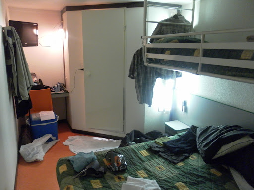 A room for two plus a breakfast for one, € 41 ! I got it via Booking.com. I thought, what the heck, give it a go! How bad can it be? What is 'bad'?||I can do 'Basic' but this barely reached subsistence level, to use an anthropological term.||The bed-linen was clean, the mattress good, there was peace and quiet at night. The staff were friendly, the breakfast excellent value at 5 euros. However, so many small niggles force me to rate it 'poor'.||||If I tell you that in the publicity literature the features listed for the rooms included 'toilet paper' and 'a rubbish bin', you may get the picture. I didn't dare use the shower. The soap/shampoo dispenser had a full bag of goo but refused to dispense me any. but the big turn-off was the absence of a bath-mat which I knew would mean a flooded bathroom floor and possibly the floor of the bedroom itself. The bathroom door had obviously suffered a lot of wetness at the bottom and the plywood face was peeling away from the interior. There was nowhere to put anything down, not enough power-points, no carpet, no refinements at all.||We were offered a 15% discount for a meal at the Campanile restaurant opposite which we didn't take up. The menu card in our room had the same photo of the same creepy chef figure as we had seen at the Metz Campanile.||The wi-fi was not advertised in the room. I asked the reception chap about it and his instructions to access it were of such Byzantine complication that I dismissed the idea.||Having the stairs outside and the room doors opening on to long outside passageways, the hotel put me in mind of the old Peabody Buildings in the east end of London or the Glasgow Gorbals. The stairs were rough, nasty concrete.||||Still, you pays yer money and... etc. I stayed several times in the Seamen's Mission in Bremen, Germany, which had a similar feel, clean but ultra-basic. You get what you pay for. I didn't pay much and I got...