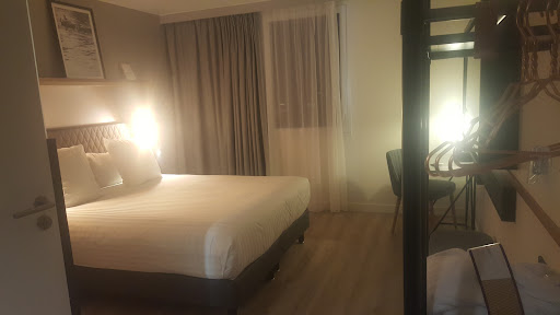 A nicely appointed modern hotel in a bizarre location surrounded by office blocks, industrial units and a railway line.We were on a coach tour and this was our last night stopover before heading for the ferry at Calais. Our courier had telephoned and warned them we were a party of almost 40 and precisely the time we would arrive. When we arrived there was one young lady on her own and she was dealing with an Asian family who were checking in, they wanted to pay cash and they don't accept it? Our courier asked if there was anyone else available, the answer was no. The next group were some Chinese who also wanted to pay cash they got the same result but became more agitated when their money was refused. At one point one of the group produced two brown envelopes and opened them, they both contained a thick wedge of new green 100 euro notes. I'd estimate there was 10,000 euros for sure and probably more. He kept offering the receptionist more money to accept his booking with a cash payment. All this pantomime had taken 20 minutes while our group were lined up at the desk and outside some were stood in the rain. Our courier interrupted and demanded to see the manager was told they were not available but a few seconds later the receptionist turned to the office door sited behind the reception and was clearly talking to someone. Meanwhile the receptionist had given us some room keys but they weren't ours. Then the woman hiding in the office appeared, she claimed to be the manager. A lot of talking and rummaging around by both eventually produced some room keys which were dumped on the desk and we were left to rummage through them and find our own keys. I was lucky I spotted my name almost straight away, The Chines guy was shouting and his offer for the room had gone up to 2000euros!! (I was tempted to pay it for him for 2000 euros with my card!). Makes you wonder about the clientele at this particular hotel doesn't it? There's nothing nearby and it was late so you are forced to eat in the hotel. In fairness the two young waiters who served us are the only ones in the hotel who know what they are doing, the meal went better than I'd expected after the earlier experience and the food was fine. We had an early start the following morning so an early breakfast had been arranged. You guessed it, it wasn't ready, I had some bread and jam and two glasses of orange juice for my breakfast only. The coffee machine wasn't working properly, the two (different) waiters were worse than useless, they did manage to produce food as we were having to leave. You can't take it out on the young staff, it's not their fault the place is completely mismanaged. Well if anyone is daft enough to consider staying at this hotel please find somewhere else for...