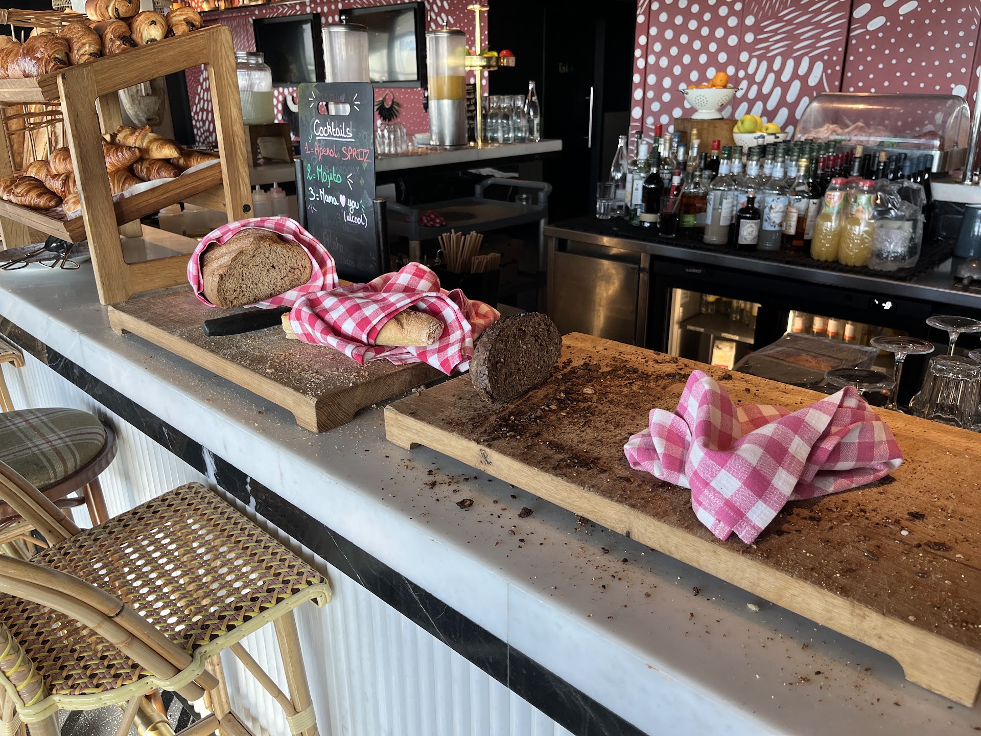 The hotel markets itself as being somewhat alternative, relaxed and unconventional, with all sorts of references to “Mama” doing this or that, which becomes rather silly after the second or third incident. The fact that “Mama loves you”, scribbled across the mirror in my room, was rather annoying than reassuring, given the fact that “Mama” had so many spectacular defects: (1) Mama is absolutely filthy! The breakfast room on the 14th floor is so unbearably dirty and unclean that you would pay money to give the place a thorough makeover. The sujet looks like one of those student parties at 03:00 a.m. when the event starts to spiral into drunken chaos - which is remarkable because the breakfast room looks like that mess just 30 minutes after opening with 10 quiet guests (Please see photos). Instead of trained service people you find a bunch of juvenile men and women with silly name badges, looking like students at their firstyear orientation event. When you ask these people politely to do some actual work, like getting a plate or cleaning the mess on the table where you are supposed to eat food, they look at you with a mixture of indignation and honest incomprehension. I am really curious to know what these kids actually thought catering for hundreds of paying customers wound involve? As far as I could tell, keeping supply coming for the buffet, returning dirty plates, refilling coffee, cleaning food plates, cleaning containers was considered indecent or inadequate to ask. I have been to hotels around the globe, but I cannot recall ever having witnessed that degree of incompetence and lack of instruction in one place! You could clearly see that these juveniles honestly had no idea, no concept, no training, no guidance or instruction on how the system around them was supposed to work, other than having a chat with their best buddy and following a sudden impulse to perform absolutely unnecessary tasks from time to time. I could go on and on, the bread is situated on one side of the rectangular buffet island - anything you might want to actually put on that bread, however, on the opposite side. Cold drinks are on the front side, warm drinks opposite on the back side - which results in loads of guests circling the buffet round and round getting increasingly unnerved. Bread crumbs, Croissant flakes virtually everywhere. Dish signs never renewed, dirty, soiled, stained. Cheese sweaty, salad leaf decorations three days old, scruffy, collapsed, wedged under the edge of the tray cover door (please see photos). High-quality Tea specialties are presented in dirty, indented tin containers, the lid open all week to ensure that all the precious flavour gets lost. (2) Mama doesn’t like soap(!). As part of some failed environmental campaign the entire hotel does not offer fluid soap or shower gel, but small bricks of soap which are so alkaline that they kill your skin’s acid barrier right away and cause rash and itching all day long. (Please see photos, I am not inventing this freak-show!) Mama thinks it’s feasible to wash your hair with a coarse brick of soap from the 1950s. How can it be environmentally friendly to distribute tiny, coarse soap blocks, each one wrapped in an inner liner and a cardboard box?? (3) Mama has no sense of smell. In my room the cleaner did a fantastic job cleaning bathroom and bed every day. However there was a noticeable stench of feces emanating from behind the cladding where the drainage pipes are located. I always wondered why nobody contacted the caretaker about this during 5 days of stay? In summary, one wild travesty of a hotel, a masterpiece walk-in gallery of failed management and lack of competence. People appreciate casual, improvised dormitory atmosphere - at the University while they are first year students, but NOT in the hospitality and service business. Dear Mama: One word of advice: If you are not passionate about food, don’t become a chef. If you don’t like serving strangers on a regular basis, then don’t...
