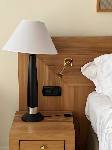 There was absolutely nowhere to plug in a phone/tablet/laptop without crawling on your knees looking for a lamp to unplug. Even the most basic hotel provides bedside plugs, but not this one.