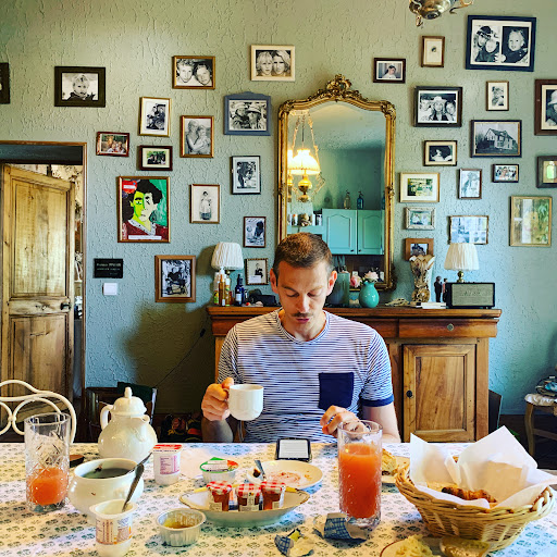 Read moreWe spent one night in Beaune on our recent visit to the wealthy wine region of Burgundy. It was a rather busy May weekend, and the accommodations were arranged late so space was at a premium. We found accommodation at this funky old hotel a few blocks from the Beaune main square. It is right next door to another, very similar older hotel in an area of older houses on a mostly local-retail street. Nothing fancy, but it was quite clean, quiet and the rooms were spacious. Baths were older, but everything worked fine...except the WiFi, which kept cutting out. My room was the very one already pictured on TA...the one with the blue print tapestry covering all the walls and ceiling. A very funky touch! Like most small hotels/B&Bs in France, the room came with a continental breakfast which was awesome (see pic) and served out in the garden. Nothing fancy, but a very comfortable stay for a reasonable price in a very speedy area. You could do much, much worse. I'd stay there again in...