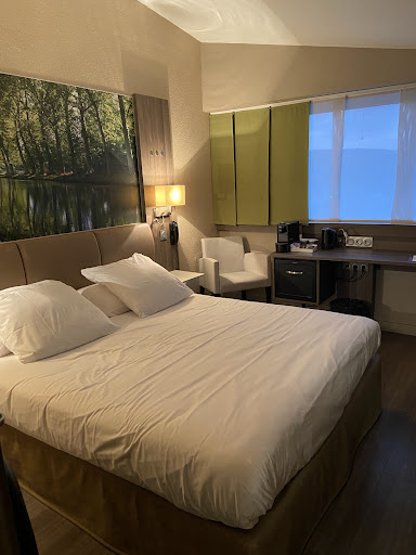 Finding wheat/gluten free places in France seems to be quite difficult. This hotel's restaurant does have "gluten free options" listed on the website so we after contacting them to make sure, we decided to book for our stopovers. Yes, they can provide gluten free bread, but you will have to ask for it and you may need to remind them (at our first breakfast they forgot we had asked for it, but on the second stopover the bread arrived very quickly). There are a couple of gluten free options for dinner, but again you may need to be a little bit persistent and double check what is on offer. Breakfast is a buffet, which can cause problems with cross contamination, but you can boil your own egg and the cheese options were possible. Not sure about the meat items as there was no description of what they contained. Butter, yogurt, fromage blanc etc are not in separate containers, but the bread is displayed on the opposite site of the room, so should reduce the chance of cross contamination. There is also fruit available. There are rice cakes and a few small gluten free biscuits - but it would be better to display them away from the gluten containing items. to sum up, it is possible to eat with a...