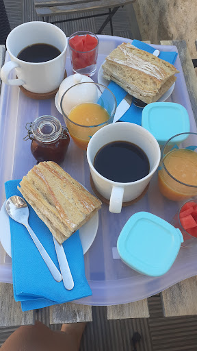 Adresse à recommander vivement qui vaut le détour ! Endroit propre, calme, voiture garée devant, accueil très sympathique, tout le confort est pensé : très bonne literie, clim, TV, jeux et jouets à disposition dans le coin enfants, plein d'attentions dans la jolie sdb : coton démaquillant et produits en lingettes si besoin, mouchoirs, cure-dents... en plus des petits produits habituels de toilette. Terrasse privative extérieure attenante avec salon de jardin. Possibilité d'y prendre le petit-déjeuner ou dans le petit espace dédié dedans, en sortant de la chambre. Il est servi à l'heure demandée. On y goûte notamment des produits maison comme yaourts et confiture et locaux (fruits). Possibilité de manger le soir aussi sous forme de plateau-repas avec produits délicieux faits maison et locaux. On y est revenus pour la 3me fois car c'est une...