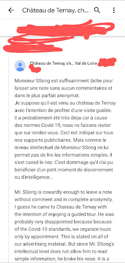 Read moreI had to write a review for our stay at the Chateau since it seems there have been several low star reviews that were not accurate. We had a long drive from Paris that put us at the chateau very late in the evening. We were kindly accommodated and warmly welcomed! At breakfast the next morning (a wonderful, traditional French breakfast of pastry, baguettes with a variety of jellies, options for yogurt, juice, tea and coffee), we were given helpful advice about things to do in the area as well as maps and literature. The following day we enjoyed a leisurely walk around the paths through the woods on the property (accompanied by the owners sweet dog, which we loved). We were also given a personal tour of the chateau which was made even more interesting because our guide was actually able to say “this is a portrait of my great-great grandmother”! It is true there was no television or internet in our room (it is available in the main sitting room), but who cares? Our family came to France to explore, see history and be out in the beautiful countryside. This place was so beautiful and peaceful, and for the large rooms, which are so beautifully decorated with stunning views, the price was absolutely a bargain. Our three day stay at Chateau de Ternay was our family’s favorite stop of our two week tour. I cannot recommend...
