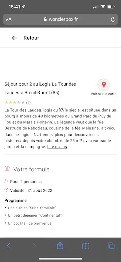 Bonjour. Je ne peux pas dire que l'accueil telephonique soit desagreable, bien au contraire. Nous avions reserve pour venir en aout, avec un coffret wonderbox, j'ai envoye le cheque de reservation et eu la confirmation de la reservation. Quelques jours avant, nous avons eu un gros probleme de voiture sur notre lieu de vacances et ma famille et moi avons ete rapatrie du nord, en taxi, à la maison dans l'ain, sans avoir pu recuperer nos affaires dans la voiture. Un semaine plus tard, quand je suis allée chercher la voiture dans le nord, j'ai vite telephoné à la tour des laudes pour annuler le séjour. A leur demande, j'ai fourni l'attestation d'assurance et j'attendais de leur nouvelles, c'était début aout...c'est moi, il y a une semaine qui ai telephone pour savoir ce qu'il en était. La gerante m'a simplement dit qu'elle avait oublie, mais que le chèque de la wonderbox de 69 euros, avait ete encaisse avant notre sejour. Elle m'a propose de revenir l'année prochaine mais vu la facon de faire, pas vraiment envie, et surtout nos vacances ne seront pas du tout dans ce meme secteur géographique. C'est la 1ère fois que nous avons ce genre de soucis avec un prestataire de wonderbox. Je peux comprendre que l'on encaisse un chèque si les gens ne viennent pas et ne donnent pas de nouvelles mais pas dans de telle condition...ca ne donne pas vraiment envie d'etre...