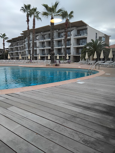 ALL THE REVIEWS ARE MISSING THE MOST IMPORTANT POINT.... The website will tell you there is two indoor pools. What it won't tell you (misleadingly) is that you can't swim in either of them... No indoor swimming in a spa hotel. Thats a first for me. We normally stay at a hotel that is part of this chain in Carnac, Brittany which unfortunately this year was being renovated. This place can't hold a candle to Carnac. Immediate first impression is that reception and the corridor off it towards the toilets constantly smelt of 'drains'. I think you know what I mean by that. It rained the entire time we were there and there wasn't much to do with no swimming pool. We had to join in the aqua-aerobics which was actually pretty fun. There is one restaurant which is supposed to change daily but hardly does. the nearest shop is 15 mins walk away and isn't very good. If you are here without a car you are completely stuck. Antibes centre is about 15 mins on the bus and there was nothing to do there. Nearly all the restaurants were closed at night unless you wanted kebabs or pizza from a hole in the wall. Food was ok at restaurant but quite expensive and usually underseasoned. All the roofs are corrugated plastic so the rain is very very loud on the roof. Our room was boiling and the air-con was erratic. When a maintenance man came to check it he said it was only possible to heat the room more as it was centrally controlled and connected to 4 neighbouring rooms. So we had to spend the rest of the stay with the balcony door open at night. Far from ideal. The wifi was very good fortunately until the hotel started to fill up with businessmen and then it dropped to a 5th of its initial speed. The place is generally old and dilapidated and in the middle of nowhere. The staff however were all brilliant. it isn't their fault its just the facilities or lack of that let the place down. The sauna is good. The stream room a little cold and the gym has no weights (only cardio machines). The pool you are allowed in has a few jets and a little jacuzzi area. The two treatments I had were ok and all the staff in the treatment areas were helpful...