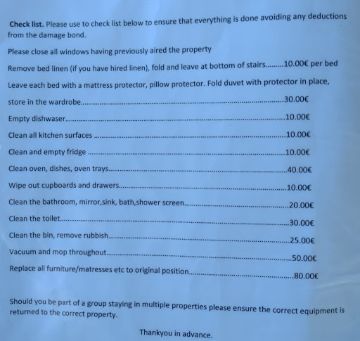 We were expected to pay if we didn't comply to some rules, again we found out about them at check in. (For example €30 for not cleaning the toilet). If we didn't comply the sum of the items was near the €300 deposit we pay.