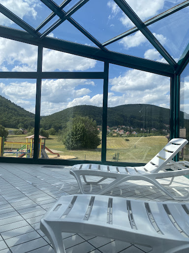 The views from the campsite across to Oberbronn are beautiful.|The campsite has all the possibility of being good but needs a bit of upkeep. The toilet block we were closest to, was shabby on the outside but clean inside.|Others have mentioned the lack of site map and I would def echo this as we didn't discover diahwashing facilities close to us till the last day and were making the trek across site. We never found the laundry facilities.|The inside swimming pool is a big plus, although sauna broken when we visited but steam room good.|Be mindful out of July/Aug reception is closed 12-4pm. So it's a late check-in compared to other places at 4pm.|Also the restaurant wasn't open and only opens July /Aug, we went end May /start of June.|Pitches were fine but there are parts of the site that can get a bit boggy.|We walked into Oberbronn, about 20 mins passing many storks nearing on top of posts! This was a Friday, only the bistro at end of the village open and then were full apparently. So we ended up having lunch at the Hotel Couvert. Serves reasonably priced, good quality food and the convent is def worth looking round as its an impressive building but we only...