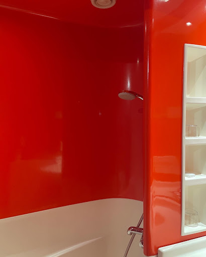 La chambre, au style années 70 inspiré de Charlotte Perriand, aurait pu avoir du charme, mais elle était visiblement défraîchie. L’isolation phonique est très mauvaise : on entend tout ce qui se passe à côté. L’éclairage est trop faible, on peine à voir quoi que ce soit une fois la nuit tombée. La salle de bain, elle aussi dans le même style, est minuscule, sans aucun espace pour poser ses affaires, et impossible de prendre une douche sans en mettre partout. Se cacher derrière un design 70’ n’est pas la solution.