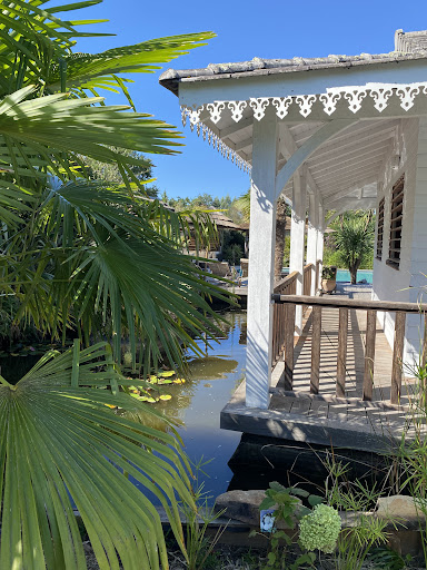 You need to really look out for the sign off the main road for this property - it's very subtle! We felt right at home at La Varangue from the first minute. There is tinkling water and pond life, wooden walkways and shady verandahs and a smallish but very clean pool. The architecure and the ambience are pure Reunion Islands - very relaxing. We had the family room with a big and comfortable four poster bed which forms the floor of the extra beds upstairs on the mezzanine. The bathroom is open plan, with twin basins, a large shower cublicle wtih good pressure, and a separate toilet. Not a lot of floor space in the bedroom, but we had a table and chairs outside our room on the communal balcony. It was very hot during our stay but the house was always pleasantly cool.||||The hosts Celine and Philippe are very friendly and helpful. Breakfast is relaxed, taken on sofas in the bar by the pool. We would have liked to have dinner on one night but sadly Philippe had his leg in plaster and couldn't cook. He did pour a good rum though!||||It's an easy drive from here to the lake and the beach. Lacanau has got a lot more touristy and crowded since our last visit ten years ago so we ended up driving north to Carcans Plage which has free parking, a good selection of restaurants and a small market on...