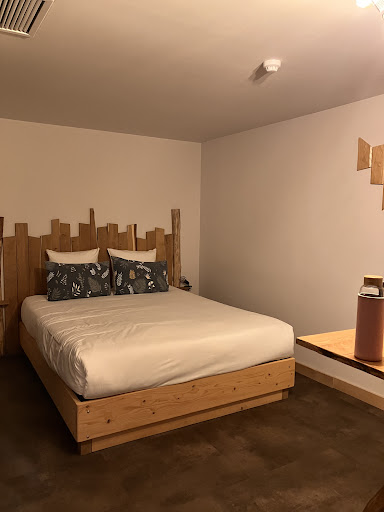 Read moreHôtel atypique bien situé L’accueil est aimable, et la chambre est propre Cependant pour le prix il nous semble qu’il y a quelques points de confort à revoir Tout d’abord aucun rangement pour y mettre ses affaires, ses vêtements Nous sommes venus pour qq jours et ça a été vraiment un manque La chambre n’est pas finie (plinthes tout juste fixées , haut de porte coulissante de sdb avec mousse isolante apparente ..) Au niveau des horaires d’ouverture de la réception c’est aussi assez limité , si vous souhaitez une boisson chaude ou autre chose (une petite bouilloire dans les chambres est un plus qui aurait été apprécié ) Le petit déjeuner à 14€/personne ne les vaut clairement pas , et le concept « à volonté « nécessite que vous redemandiez si vous voulez un autre café , ou du pain frais , à la réception Tout n’est pas à dispo et pour le prix j’imaginais vraiment un buffet plus varié Nous aurions pris le petit déjeuner chaque matin pour 8/10€ Max, mais la nous avons préféré nous débrouiller par nous mêmes Enfin, le Système de store et de rideaux n’est malheureusement pas occultant, nous avons été gênés par le jour, et chaque matin nous avions énormément de buée sur les fenêtres Les extérieurs sont en cours d’aménagement et le potentiel est là Le restaurant devrait ouvrir bientôt Nous souhaitons une belle aventure à cet...
