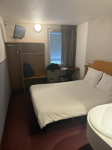Read moreBon a ce prix là faut bien sûr pas s attendre aux prestations du Meurice ou du Georges V .. Donc pour être objectif c est globalement correct , le problème est que si vous ne faites pas attention et que vous quittez votre chambre avec les clés à l intérieur vous dormez à la belle étoile, ou dans votre voiture.. C est la mésaventure vécue semaine dernière pour une étape Lyon - Carnac , nous sommes 2 adultes et 2 ados et réservons 2 chambres à côté.. les filles claquent leur porte à 21h30 avec les clés dans la chambre et impossible de joindre quelqu un pour venir ouvrir .. On s est retrouvé à dormir à 4 ds une chambre avec une chaleur de dingue (la clim c à partir de 2 * je crois ..) Faudrait préciser au check un ou dans la chambre de faire attention , et quant au soit disant n. d urgence je suis toujours à sa recherche.. Le personnel est très sympa et le p’tit dej correct pour ce prix, l environnement direct de l hôtel fait pas rêver mais pratique pour dîner le soir rapide sans prendre la voiture.. Donc bien pour une étape mais service de nuit...