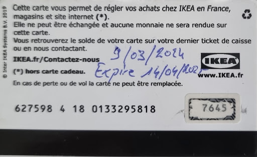 Le 5 août 2025, mes parents se rendent à IKEA pour utiliser cet avoir. Le personnel gratte la partie contenant le code, tente de l’utiliser sans succès, puis consulte un supérieur. Ce dernier leur rend la carte avec une mention manuscrite indiquant une date d’émission au 09/03/2024 et une date d’expiration au 14/04/2025. On leur explique alors que l’avoir est désormais inutilisable, sans autre solution proposée.