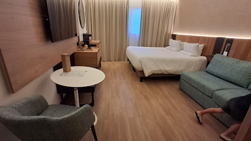 Read moreThe hotel itself was very good, with the pool being quite big, clean and warm, the breakfast buffet was decent though there were a few problems like bad scrambled egg quality and complex coffee machines but beyond that it was lovely. The lobby and guest facilities were all clean and nice, aswell as the room, which, despite being rather small, was not unpleasant. The toilet is in a different room to the shower and doesn't have a lock which is a bit displeasing so I would advise to consider this when booking. As for the location, as far as we discovered in our 1 night stay, it was not amazingly located, as it was 10km from the beach that we went to which seemed to be the main one in Montpellier. It was also about a 20 minute drive from a retail park with a amazing aquarium that we visited along with multiple restaurants and other food establishments, a large IKEA, Decathlon and Casino. This hotel was probably the best that we stayed at out of 4 and I would recommend it for families...