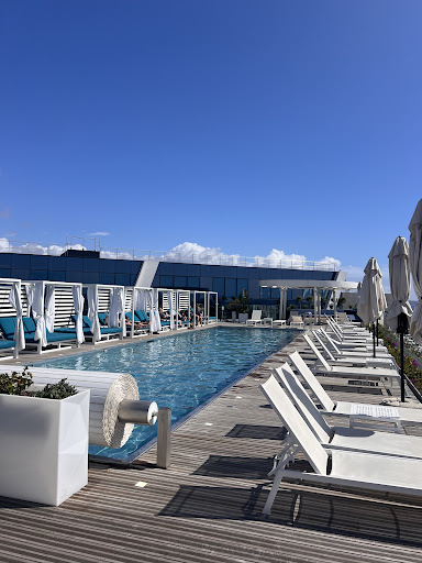During the day, you can spend time in the courtyard, or at the magnificent pool on the roof, which comes with great views (pic included). At night on the rooftop, you can relax at the bar and get nice nighttime views of the airport area.