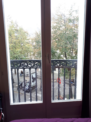 When we arrived at the hotel, we showed the receptionist our passports. My brother paid the room tax of in Euros for seven nights, but upon counting his change, he realized that he was short-changed by 5 Euros. When informed of his mistake, the receptionist gave him the 5 Euros. Afterwards, we got the key and took the elevator to our third floor room, which faced a small triangular park on Rue Charlot.