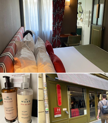 Now on to the - sadly greatly outweighing - bad: -Noise (inside): at 8am builders started work in the hall; sadly, the doors are more cardboard than wood, so our night was over; the flushing of the toilets in the floors above rings through the whole room; other guests thought it was fun to hold a conference in the halls, and while this is not the hotel's fault, better doors would've made it bearable at least. -Bed size: I guess its a general french problem, but 190cm beds are a joke. -Room size: next to the bed, we were just about able to open on suitcase on the floor; for a "standard double" we expected to at least walk around without having to hobble around objects -Shower: 180cm high, perfect height to hit my head multiple times. -Toilet: bearly enough space to sit down. -- all these issues stem from too little space, if you book here, dont get the "cheapest" room. -coffee machine: leaky, nice for a surprise foot bath on the floor. Lastly: -elevator was out for a few days, reception told us "they were on their way", yeah, monday it was i guess. If you were on the 6th floor, at least you would be able to get in a grand workout.