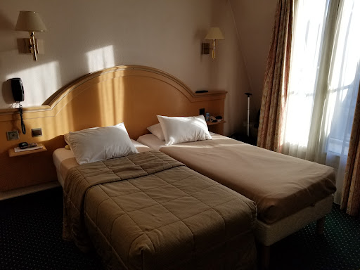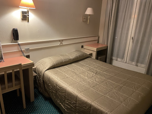 It is advertised as a three star and that’s what you get but I would stay there again. First the cons: The rooms are small but most rooms in Paris are small so not a surprise but that’s what you get. No coffee maker in your room. There is a machine in the lobby but hey, what can I say, I like a coffee first thing and would rather not trudge downstairs for one. The pros: The staff there are great. Helpful, kind, considerate and efficient. We had room 64; the top floor. We had a little balcony that we would spread a blanket on the landing at night and have some wine. It was FANTASTIC. It’s tiny but it worked for us. Great way to end the day. It has a working elevator—- not a sure thing in Paris. It’s located in the Latin quarter so it is quiet at night. It’s about a 15-20 minute walk to Notre Dame. We used the bus and metro which have stations about 5-8 mins. from the hotel lobby so easy to get around. The rooms are clean and the bed is comfy. The a/c works great and we slept like the dead. We were gone all day so this was a place to sleep, shower and get on our way. If your that kind of people, you are good to go here. Lots of cafe and eateries everywhere and a pharmacy across the street. There is a cigarette shop just down the street and that’s where we bought our French SIM card for our phones. Nothing to it. You pop the old sim out ( CAREFULL here! Have something ready to put your home sim in) pop the new one in, restart your phone and just like that your in business. You will be given a French phone number you can use. Handy to have that store...