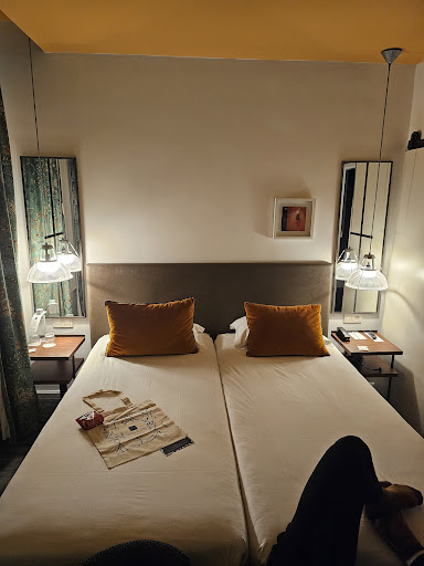 Pros: Friendly lady at the front desk allowed us to check in a few hours early Great location, walking distance to La Marais shops and cafes, and very close to Plaza de Voges. Minutes away from Bastille plaza, metros and grocery stores Clean room and comfortable bed Nice shower and water pressure Water bottle in room every day Housekeeping every day Helpful staff (gave us extra blanket) Balcony Chromecast TV Travel adapters available upon request Good wifi Cute lobby and terrace - water and pastries available in lobby