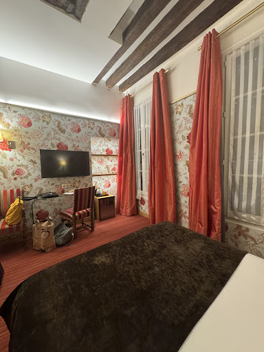 Read moreStaff was very friendly. Lots of stairs here. Our room was beautiful with a lovely pattern on the walls and modern bathroom. Our bed was actually two twin beds pushed together. We got the fruit basket which was great. In staying here again, I would try for a room on a lower floor, try to pack shoes which are both cute and comfortable, and assume that when coming from the U.S. you will sleep through breakfast and sometimes lunch. There was a hot water kettle in the room, a little instant coffee, and a fridge / minibar we never opened. Dinner places often open late and stay open late so that's no problem. We had protein bars & granola that we packed and did use up due to that whole time change. If doing this again, I'd pack some more things to make a quick breakfast or snack from. Crackers, peanut butter, instant oatmeal, my own instant coffee or tea & a few tiny creamers and sweetener. Eateries in close walking distance were sushi, kebabs, etc, with creperies a further stroll onto other streets. The elevator is compact, and the stairs somehow cause you to feel like a tipsy existentialist. I'd seriously think twice about traversing them in heels, or if you did have a drink (especially going down). The lobby had cute portraits of animals dressed like nobility with people bodies. You leave the very antique key w the desk each time you leave. Our room window actually opened out wide to a nice view of other...