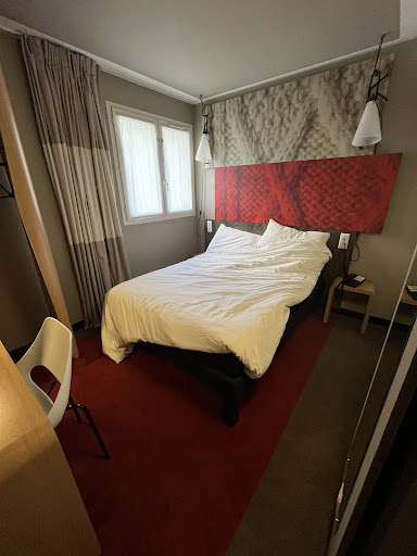 After you've finally gotten to your room, you'll find no safe in the room, no minibar or fridge, and barely any space to hang your clothes and stow your belongings. Only one side of the bed has a bedside table, so you'd better only come here if you're travelling alone and have absolutely minimalistic requirements and for some reason want to pay more (check out Reims Hotel about a 5 minute walk up the road for a similar no frills experience, but with friendlier staff, cleaner rooms and cheaper prices). The decor is supposed to be modern, but looks like a bad student hostel instead.